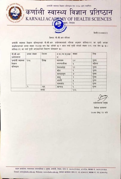 दैलेख । दैलेखमा एकै पटक एकसय ५ जनामा कोरोना संक्रमणको पुष्टी भएको छ । कर्णाली स्वास्थ्य विज्ञान प्रतिष्ठान शिक्षण अस्पताल जुम्लामा बिहीबार दिउँसोसम्म गरिएको पीसीआर परीक्षणमा दैलेखका एक सय ५ र मुगुका एकसहित एक सय ६ जनामा कोरोना पोजिटिभ देखिएको हो ।