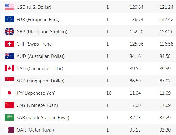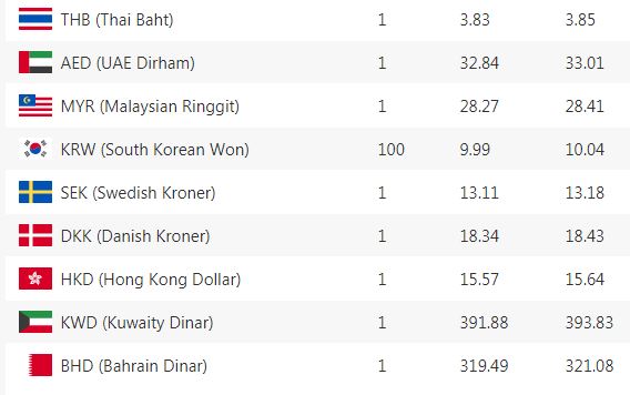 युएई दिराम एकको खरिददर ३२ रुपैयाँ ८४ पैसा छ भने बिक्रिदर ३३ रुपैयाँ १ पैसा रहेको छ। मलेसियन रिँगिट एकको खरिददर २८ रुपैयाँ २७ पैसा तथा बिक्रिदर २८ रुपैयाँ ४१ पैसा रहेको छ।