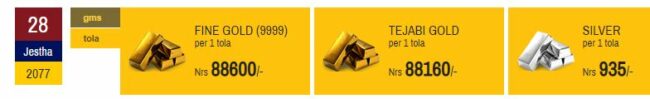 आज बुधबार, छापावाल सुन प्रतितोला ८८ हजार ६०० तथा तेजावी सुन प्रतितोला ८८ हजार १६० रुपैयाँमा कारोबार भइरहेको नेपाल सुनचाँदी व्यवसायी महासंघले जनाएको छ ।