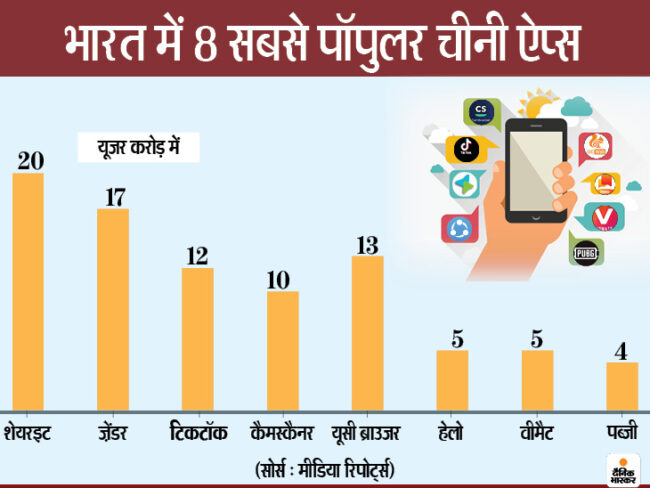 भारतीय बजारमा चीनका कम्पनीको स्मार्टफोन मात्र होइन चिनियाँ एप्सपनि निकै लोकप्रिय छन् । एक अनुमानका अनुसार भारतीय एप बजारमा ४० प्रतिशत हिस्सा चिनियाँ एपको छ । चीनका कम्पनहिरु सस्ता स्मार्टफोनहरु भारतीय बजारमा लञ्च गर्छन् र भारतीयले यिनीहरुलाई मन पराउँछन् । मार्केट रिसर्च फर्म टेकआर्कका अनुसार डिसेम्बर २०१९ सम्म भारतमा ५० करोडभन्दा धेरै मानिसहरु स्मार्टफोन प्रयोग गरिरहेका थिए । स्मार्टफोन धेरै भएसँगै एप्स डाउनलोड पनि धेरै हुन्छ । कैयौं पटक प्रतिबन्ध लगाउन माग उठिरहेको टिकटक एप १२ करोडभन्दा धेरै भारतीयले चलाउँछन् । क्यामस्क्यानर एपका पनि भारतमा १० करोडभन्दा धेरै प्रयोगकर्ता छन् ।