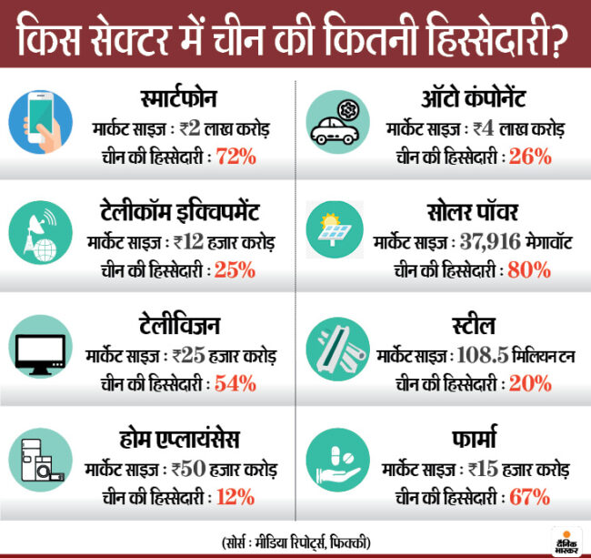 यही बीचमा भारतमा चीनविरोधी अभियान सुरु भएको छ जसरी नेपालमा पनि भारतविरोधी अभियान चलिरहेको छ । रोचक त के भने जसरी नेपाल आफ्नै अत्यावश्यक वस्तुको लागि भारतमाथि निर्भर छ त्यसैगरी भारतको अर्थतन्त्र चीनको कब्जामा छ । भारतमा अहिले चीनविरोधी अभियान चलिरहेका बेला भारतीय अखबार दैनिक भास्करले एक रिपोर्ट प्रकाशित गरेको छ जसमा भारत चीनमाथि कतिसम्म निर्भर छ भन्ने तथ्यांक विस्तृतमा उल्लेख खरिएको छ ।