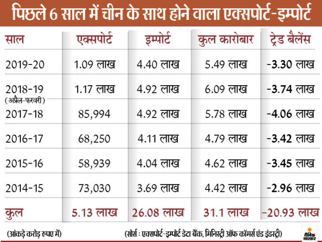 भारत–चीनबीचको व्यापारको परिमाण निकै ठूलो छ र यसलाई भारतले चाहेर पनि घटाउन सक्दैन । तथ्यांकका अनुसार अप्रिल २०१९ देखि फेब्रुअरी २०२० सम्मको अवधिमा भारत र चीनबीच ५ लाख ५० हजार करोडको कारोबार भएको छ । यसमा भारतले १.०९ लाख करोडको सामान चीनलाई बेचेको छ । जबकि यसको ४ गुणा बढी अर्थात ४.४० लाख करोडको सामान भारतले चीनसँग किनेको छ । अमेरिकापछि चीन भारतको दोस्रो ठूलो व्यापारिक देश हो । यो तथ्यांक भारतको उद्योग तथा बाणिज्य मन्त्रालयको हो ।