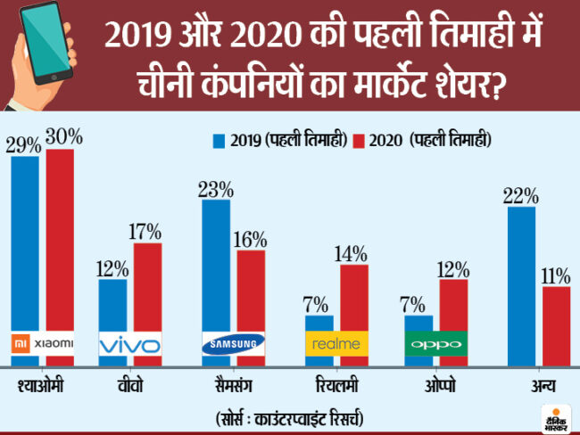 रिसर्च फर्म काउन्टरप्वाइन्टको रिपोर्ट अनुसार २०२० को पहिलो त्रैमासिक अर्थात जनवरीदेखि मार्चको अवधिमा भारतीय स्मार्टफोन बजारमा चिनियाँ कम्पनीमा स्मार्टफोनको हिस्सेदारी ७० प्रतिशतभन्दा धेरै छ । भारतको स्मार्टफोन बजार करिब २ लाख करोड रुपैयाँको छ । भारतमा प्रयोग हुने टप ५ स्मार्टफोन ब्राण्डमध्ये ४ ब्राण्ड चीनका हुन् । सबैभन्दा धेरै ३० प्रतिशत बजार श्याओमीको छ । दोस्रो स्थानमा १७ प्रतिशत बजार हिस्साको साथमा भीभो छ । टप ५ मा चीनबाहिरको एकमात्र ब्राण्ड सामसुङ हो । दक्षिण कोरियाली ब्राण्ड सामसुङको भारतीय बजारमा १६ प्रतिशत हिस्सा छ ।