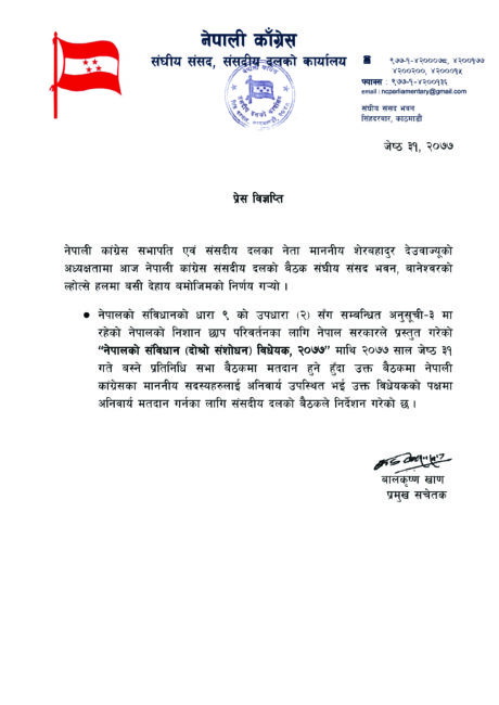 ‘नेपालको संविधानको धारा ९ को उपधारा (२) सँग सम्बन्धित अनुसूची–३ मा रहेको नेपालको निशान छाप परिवर्तनका लागि नेपाल सरकारले प्रस्तुत गरेको नेपालको संविधान (दोस्रो संशोधन) विधेयक, २०७७ माथि २०७७ जेठ ३१ गते बस्ने प्रतिनिधिसभा बैठकमा मतदान हुने हुँदा उक्त बैठकमा नेपाली कांग्रेसका माननीय सदस्यहरुलाई अनिवार्य उपस्थित भई उक्त विधेयकको पक्षमा अनिवार्य मतदान गर्नका लागि संसदीय दलको बैठकले निर्देशन गरेको छ,’ वैठक पछि जारी विज्ञप्तिमा भनिएको छ।