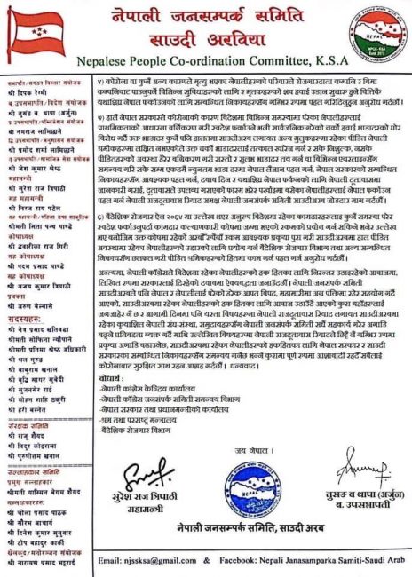 समितिले हालसम्म साउदीअरबमा कोरोना संक्रमित नेपालीहरु, उपचार भइरहेका, कोरोना निको भएका र कोरोनाबाट ज्यान गुमाउनेको यकिन तथ्याङ्क सार्वजनिक गर्न पनि माग गरको छ।
