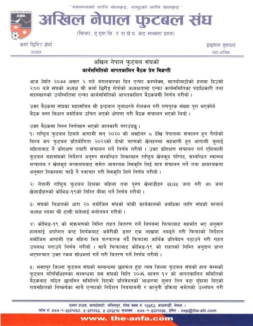 काठमाडौं । नेपाली राष्ट्रिय फुटबल टिमको प्रशिक्षण आगामी महिना जुलाईबाट सुरु हुने अखिल नेपाल फुटबल संघ (एन्फा) ले जनाएको छ । मंगलबार एन्फाको कार्य समितिको बैठकले विश्व कप फुटबल प्रतियोगिता २०२२ को दोस्रो चरणको खेलहरुमा सहभागी हुन आगामी जुलाईबाट नै प्रशिक्षण सुरु गर्ने जनाएको हो । उक्त प्रशिक्षण संचालन गर्न एशियाली फुटबल माहासंघ (एएफसी) को निर्देशन अनुरुप सम्बन्धित निकायहरु राष्ट्रिय खेलकुद परिषद, सम्बन्धित स्वास्थ्य मन्त्रालय र खेलकुद मन्त्रालयबाट समेत स्विकृत लिएर मात्रै प्रशिक्षण सुरु गर्ने एन्फाले जनाएको छ ।