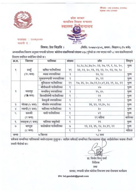 गण्डकी प्रदेशका तनहुँ, नवलपरासी, म्याग्दी, स्याङ्जा, कास्की र बागलुङ्मा गरी ५८ जनामा संक्रमण पुष्टि भएको स्वास्थ्य निर्देशनालय गण्डकी प्रदेशले जनाएको छ । यो सँगै गण्डकी प्रदेशमा कोरोना संक्रमितको संख्या ४३८ पुगेको छ ।