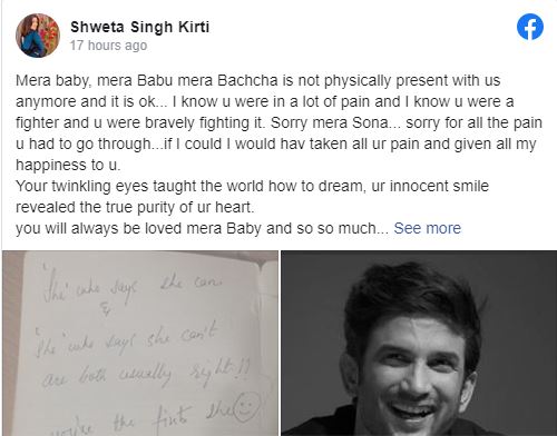 श्वेताले बुधबार फेसबुकमा सुशान्तको लागि भावुक पोस्ट लेखेकी थिइन् । तर, पछि त्यो पोस्ट पनि डिलिट गरेकी थिइन् । उनले यो पोस्टमा एउटा कार्ड पनि शेयर गरेकी थिइन् जो सुशान्तले उनको लागि लेखेका थिए । सुशान्तले १४ जूनका दिन बिहान आफ्नो मुम्बइस्थित घरमा आत्महत्या गरेका थिए । १५ जूनमा परिवारको उपस्थितिमा सुशान्तको अन्तिम संस्कार भयो । श्वेता भने अमेरिकाबाट १७ जूनमा मात्र आउन सकेकी थिइन् । फेशन डिजाइनर श्वेता अमेरिकाको क्यालिफोर्नियामा बस्दै आएकी छिन् ।