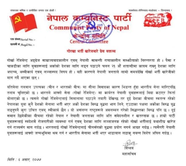 अहिले गलवान उपत्यकामा भारत र चीनबीच तनाव बढेका बेला भारतले गोर्खा रेजिमेन्टमा कार्यरत नेपाली युवालाई विदा कटाएर बोलउनुले भारतले उनीहरुलाई सीमामा खटाउन लागेको बुझिएको भन्दै नेकपाले भनेको छ ‘दुई देशका बीचमा स्वतन्त्र रहेको नेपालका युवा कुनै देशको सेनामा भर्ती भएर अर्को देशका विरुद्ध युद्धमा भाग लिने, एउटाको पक्षमा र अर्कोका विरुद्धमा युद्ध लड्नुपर्ने कुरा उचित एवम् स्वीकार्य छैन ।’