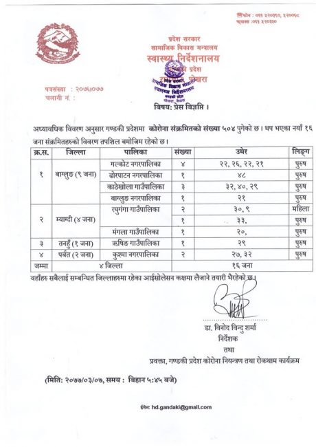 निर्देशनालयका अनुसार, बाग्लुङमा ९, म्याग्दीमा ४, पर्वतमा २ र म्याग्दीमा १ गरी १६ जनामा कोरोना पोजेटिभ देखिएको हो ।