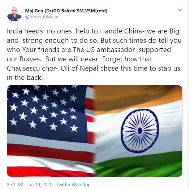 भारतका रिटायर्ड मेजर जनरलको नेपालप्रति अपमानजनक ट्वीट