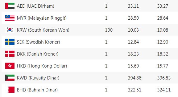 युएई दिराम एकको खरिददर ३३ रुपैयाँ ११ पैसा छ भने बिक्रिदर ३३ रुपैयाँ २७ पैसा रहेको छ। मलेसियन रिँगिट एकको खरिददर २८ रुपैयाँ ५० पैसा तथा बिक्रिदर २८ रुपैयाँ ६४ पैसा रहेको छ।