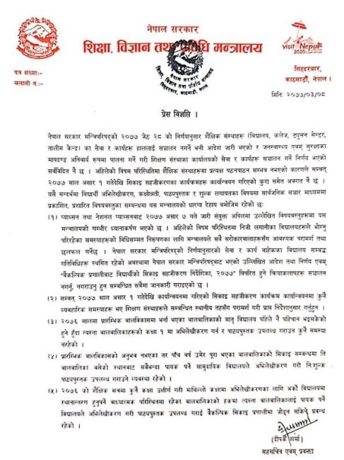 निजी विद्यालयलाई शुल्क नलिन सरकारको निर्देशन