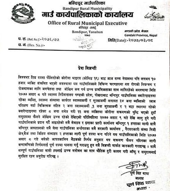 गाउँपालिकाले एक विज्ञप्ति जारी गर्दै, बन्दिपुर अस्पतालका सबै सेवा, गाउँपालिका भित्रका सबै सरकारी कार्यालय, गैरसरकारी संस्था, निजी क्षेत्र, बैंक तथा वित्तीय संस्थाहरु दुई हप्ताका लागि पूर्ण रुपमा बन्द गर्ने जनाएको छ ।