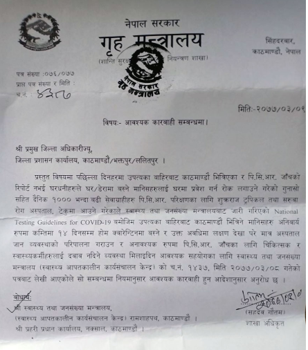 उपत्यका बाहिरबाट आउनेलाई घरबेटीहरुले कोठमा जान नदिएपछि उनीहरु कोरोना परीक्षणका लागि टेकु अस्पताल जाने गरेका छन। तर, अस्पताले भने कोरोना परीक्षण गरिदिँदैन। यसरी नागरिकहरु समस्यामा परिरहेका बेला गृहमन्त्रालयले होम क्वारेन्टिन बस्नुपर्ने निर्देशन दिएको हो।