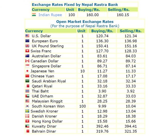 आज अमेरिकी डलर एकको खरिददर १२० रुपैयाँ ७४ पैसा तथा बिक्रिदर १२१ रुपैयाँ ३४ पैसामा झरेको छ । यूरोपियन यूरो एकको खरिददर १३६ रुपैयाँ ३० पैसा तथा बिक्रिदर १ सय ३६ रुपैयाँ ९८ पैसा रहेको छ।