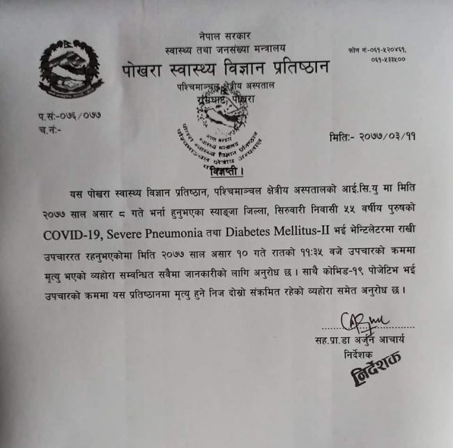 पोखरा स्वास्थ्य विज्ञान प्रतिष्ठान, गण्डकी अस्पताल पोखराको आइसीयूमा उपचाररत ५५ वर्षीय पूरुषको बुधबार राति ११ः५५ बजे मृत्यु भएको स्वास्थ्य निर्देशनालय, गण्डकी प्रदेशले पुष्टि गरेको छ ।