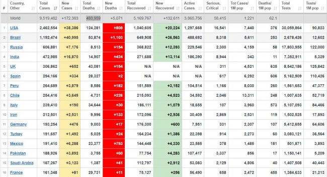 विश्वभर महामारीको रुप लिएको कोरोना भाइरसको संक्रमणबाट ज्यान गुमाउनेको संख्या ४ लाख ८३ हजार ९५९ पुगेको छ । यो समाचार तयार पार्दासम्म विश्वभर ९५ लाख १९ हजार ४८२ जना मानिस संक्रमित भएका छन् । बुधबार मात्रै १ लाख ७२ हजार ३८३ जना नयाँ संक्रमित थपिएका छन् भने ५ हजार ७१ जनाको ज्यान गएको छ ।
