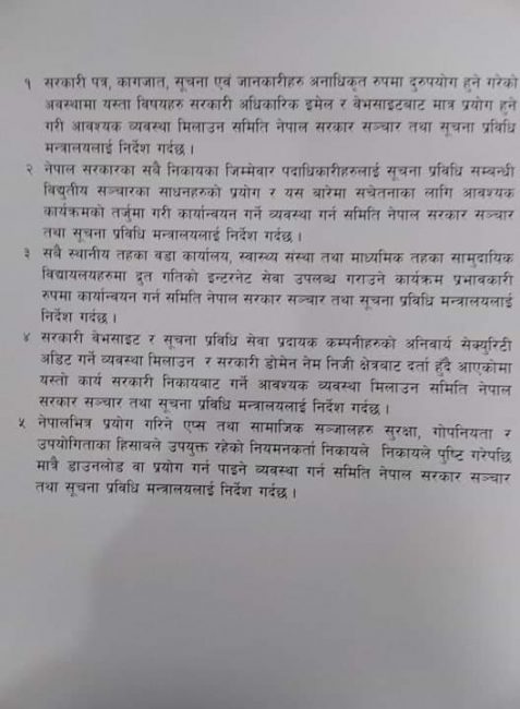 समितिले भनेको छ, ‘नेपाल सरकारका सबै निकायका जिम्मेवार पदाधिकारीहरुलाई सूचना प्रविधि सम्बन्धी विद्युतीय सञ्चारका साधनहरुको प्रयोग र यस बारेमा सचेतनाका लागि आवश्यक कार्यक्रमको तर्जुमा गरी कार्यान्वयन गर्ने व्यवस्था गर्न समिति नेपाल सरकार सञ्चार तथा सूचना प्रविधि मन्त्रालय लाई निर्देश गर्दछ ।’