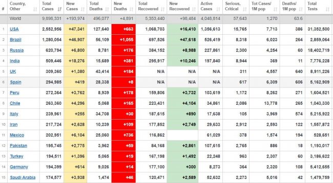 यो सँगै विश्वभर कोरोना संक्रमितको संख्या ९८ लाख ९८ हजार ३३१ पुगेको छ।