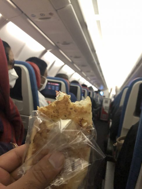अनि खाना स्वरुप खैरो कागजको ब्यागमा लामो पाउरोटीमा नुनिलो सेतो चिज र गोलभेडा हालेको स्यान्डविच, जुसको प्याकेट र सानो गुलियो पाउरोटी ल्याएर दिए । भोक लागेको बेलामा त खाइयो र लाग्यो यो स्न्याक्स होला, एक छिनमा तातो खाना ल्याउला भन्ने आशा गरियो तर उस्तै स्यान्डविच ल्याएर ‘खाए खा नखाए घिच’ भने जसरी ल्याएर राखिदियो । मेरै अगाडी एक बाको त खाली लामो सादा पाउरोटी मात्रै थियो । त्यो पनि बल्ल बल्ल खाइयो । चाउचाउ, दालमोठ र बिस्कुट बोकेका साथीहरुले भने आफुसँग भएको खानेकुरा बाँडेर खाएको पनि देखियो ।