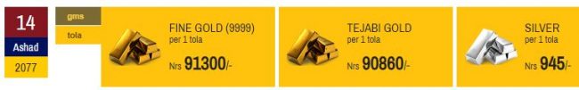 यसअघि छापावाल सुन ९१ हजार १ सय रुपैयाँ, तेजावी सुन ९० हजार ६६५ र चाँदी ९३५ रुपैयाँमा कारोबार भएको थियो ।