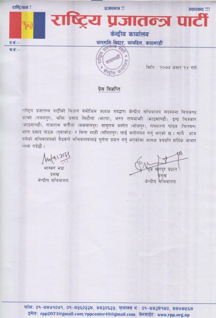राष्ट्रिय प्रजातन्त्र पार्टीको सचिवालयले पायो पूर्णता