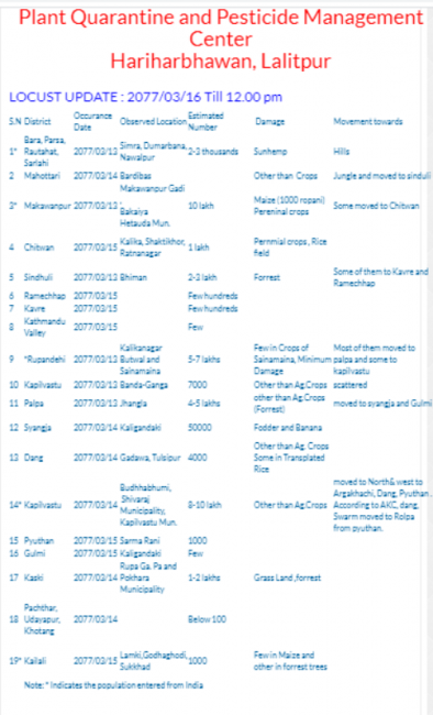 सेन्टरका अनुसार पहिलो दिन पाँचवटा जिल्लामा देखिएको सलह मंगलबारसम्म आइपुग्दा २६ वटा जिल्लामा देखिएको छ। सलह पूर्वी तराईँका जिल्लामा देखिएको छैन भने सुदूर पश्चिमको कैलालीको धनगढी क्षेत्रमा देखिएको सेन्टरले जनाएको छ। यस्तै पूर्वी पहाडको खोटांग, पाँचथर र उदयपुरमा देखिएको छ।