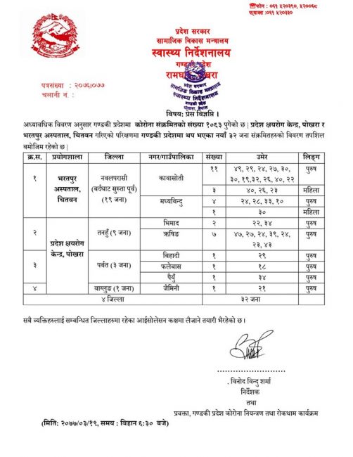 प्रदेश क्षयरोग केन्द्र, पोखरा र भरतपुर अस्पताल, चितवनमा गरिएको परिक्षणमा गण्डकी प्रदेशका ४ जिल्लामा ३२ जनामा कोरोना संक्रमण पुष्टि भएको स्वास्थ्य निर्देशनालय, गण्डकी प्रदेशले जनाएको छ।