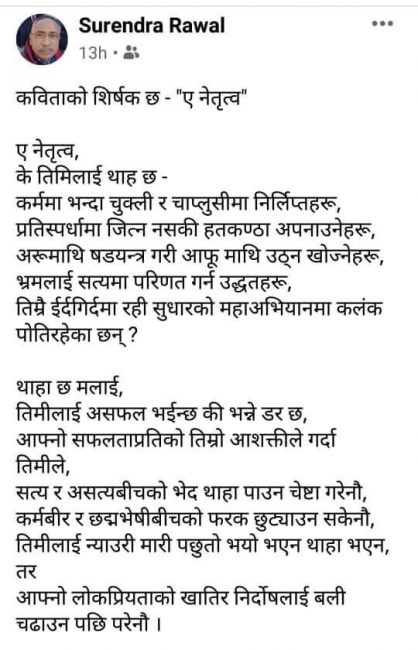 “ए नेतृत्व” शीर्षकमा कविता लेख्दै उनले आफूमाथिको कारवाही अन्यायपूर्ण भएको जिकिर गरेका हुन् । कवितामा उनले चाकडी चाप्लुसीमा निर्लिप्त हुनेहरुको कुरा सुनेको, प्रतिष्पर्धामा जित्न नसकी हत्कण्डा अपनाउनेहरु र भ्रमलाई सत्यमा परिणत गर्ने वरिपरि रहेकाहरुबाटै नेतृत्वमाथि(सेनापति) कलंक पोत्ने काम भएको जिकिर गरेका छन् । उनले कवितामै नेतृत्वलाई सोधेका छन्,“न्याउरी मारी पछुतो भयो भएन थाहा भएन ।”