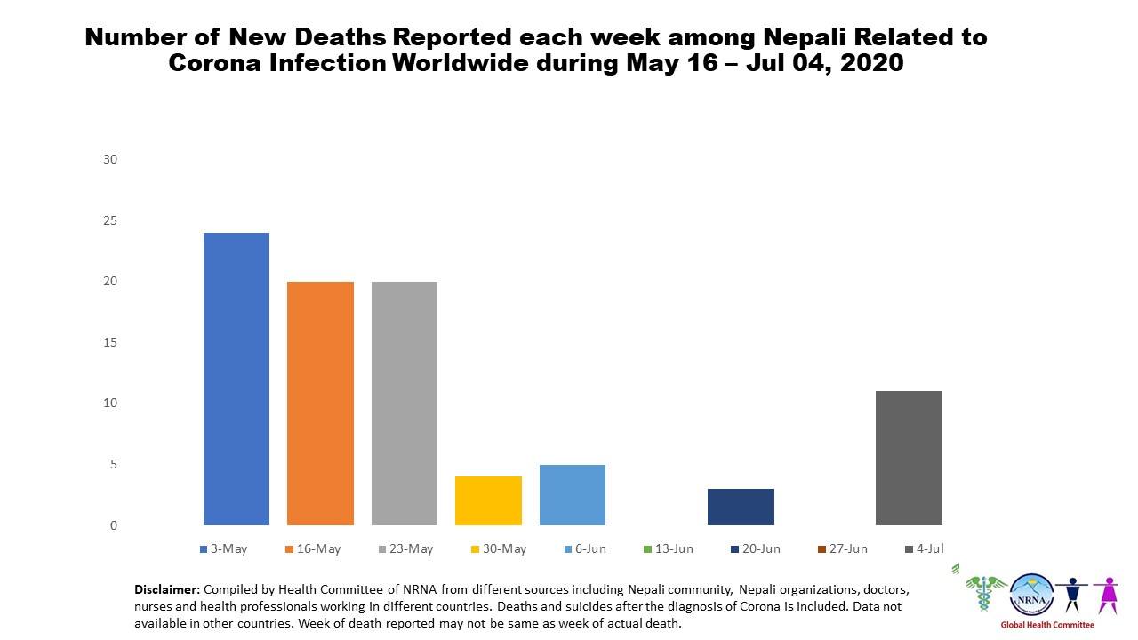 हालसम्म बेलायत, अमेरिका, यूएई, साउदी अरब, बहराइन, कुवेत, कतार, आयरल्याण्ड, जापान, टर्की, नेदरल्याण्ड,स्वीडेन, ओमन र भारतगायतका देशमा रहेका नेपालीहरुको कोरोना भाइरस संक्रमणका कारण ज्यान गएको छ ।