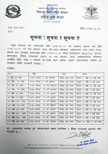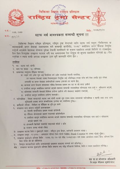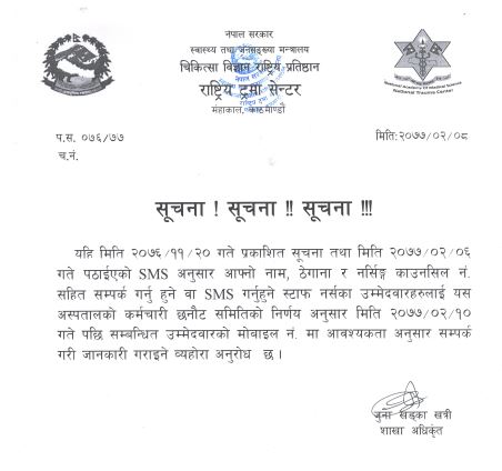 सेन्टरले गत फागुन २० गते २५ जना स्टाफ नर्स आवश्यक रहेको भन्दै सूचना प्रकासित गरेको थियो।