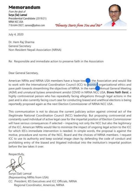 एनआरएनए अमेरिकाको गत निर्वाचनमा अध्यक्षका प्रत्यासी रहेका सूर्य लम्सालले अमेरिकाबासी एनआरएनहरुको तर्फबाट भन्दै जुलाई ४ मा अन्तर्राष्ट्रिय समितिका महासचिव डा.हेमराज शर्मालाई सो पत्र पठाएका हुन् । पत्रमा तत्काल उचित कदम चाली संस्थाप्रतिको विश्वास कायम गराउन भन्दै विश्वनाथ बराललाई फेरि एनआरएनए एनसीसी अमेरिकाको निर्वाचन आयुक्त बनाउन लागेकोले त्यस्तो कदम रोक्न माग गरिएको छ ।