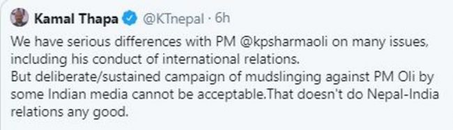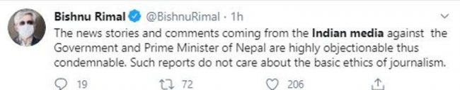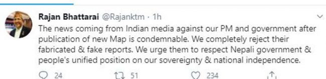 यस्तै प्रधानमन्त्री ओलीका विदेश मामिला सल्लाहाकार डा. राजन भट्टराईले पनि ट्वीटरमाफर्त नै भारतीय सञ्चार माध्यमको आलोचना गरेका छन्। उनले लेखेका छन्, ‘नेपालले नयाँ नक्सा जारी गरेपछि भारतीय सञ्चार माध्यमहरुले नेपाल र नेपाल सरकारविरुद्ध अफावह फैलाइरहेका छन्। ती स्वीकार्य छैनन्। देशको सार्वभौम सत्ताप्रति सबै नेपाली एकजुट छौं।’