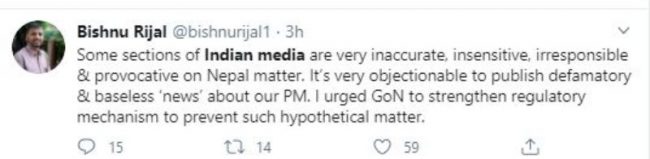 उता नेकपा विदेश विभाग उपप्रमुख विष्णु रिजालले पनि भारतीय सञ्चार माध्यमप्रति आक्रोश पोखेका छन्।
