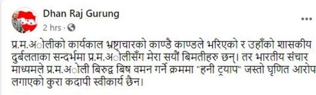 उनले सामाजिक सञ्जाल फेसबुकमा लेखेका छन्, ‘प्रम ओलीको कार्यकाल भ्रष्टाचार काण्डै काण्डले भरिएको छ। र शासकीय दुर्वलताका सन्दर्भमा प्रम ओलीसँग मेरो सयौं बिमतीहरु छन्। तर भारतीय सञ्चार माध्यमले प्रम ओलीविरुद्ध विष वमन गर्नेक्रममा हनी ट्र्याप जस्ता घृणित आरोप लगाएको कुरा कदापी स्वीकार्य छैन।’