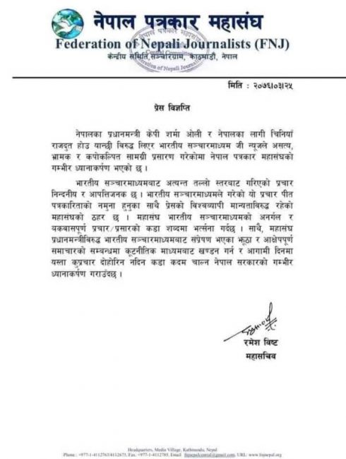 भारतीय सञ्चारमाध्यमले प्रधानमन्त्री ओलीको चरित्र हत्या गरेको भन्दै नेपाल पत्रकार महासंघले पनि आपत्ति जनाएको छ। बिहीबार एक प्रेस विज्ञप्ति जारी गर्दै बिहीबार जी न्यूजले प्रशारण गरेको समाचारको निन्दा गर्दै त्यसको कुटनीतिक माध्यमबाट खण्डन गर्न पनि नेपाल सरकारसँग माग गरेको छ।