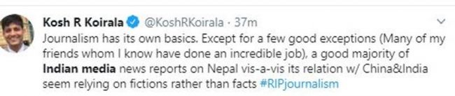यस्तै पत्रकार कोषराज कोइरालाले पनि भारतीय सञ्चार माध्यमहरुमा पछिल्ला दिनहरुमा नेपालविरुद्ध प्रसारण भइरेहका समाचारको आलोचना गरेका छन्।