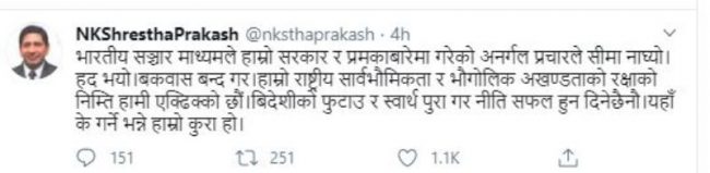 यस्तै नेकपा प्रवक्ता नारायणकाजी श्रेष्ठले भारतीय सञ्चार माध्यमहरुलाई बकवास बन्द गर्न भनेका छन्। उनले लेखेका छन्, ‘भारतीय सञ्चार माध्यमले हाम्रो सरकार र हाम्रो प्रमबारे अनर्गल प्रचारले सीमा नाघ्यो। हद भयो। बकवास बन्द गर। हाम्रो राष्ट्रिय सार्वभौमिकता र भौगोलिक अखण्डताको रक्षाको निम्ती हामी एक ढिक्का छौं। विदेशीको फुटाऊ र स्वार्थ पुरा गर नीति सफल हुन दिने छैनौं। यहाँ के गर्ने भन्ने हाम्रो कुरा हो।’