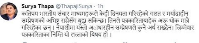 यस्तै प्रधानमन्त्री ओलीका प्रेस सल्लाहाकार सुर्य थापाले पनि भारतीय सञ्चार माध्यमको आलोचना गरेका छन्। उनले पनि भारतीय सञ्चार माध्यमले तथ्यहीन, कपोकल्पित समाचार प्रसारण गरेको भन्दै ती समाचारका पछाडि खराव नियत रहेको बताएका छन्।