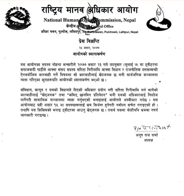 काठमाडौं । राष्ट्रिय मानव अधिकार आयोगले आफ्नै सदस्य मोहना अन्सारीले केही दिनअघि दिएको अभिव्यक्तिप्रति खेद प्रकट गर्दै भ्रम सिर्जना हुने गरी नबोल्न सचेत गराएको छ । अन्सारीले यही असार २३ गते सामाजिक सञ्जाल ट्वीटरमा समाजवादी पार्टीकी सांसद सरिता गिरीलाई कारवाही गरिएकामा खेद प्रकट गर्दै आपत्ति जनाएकी थिइन् ।