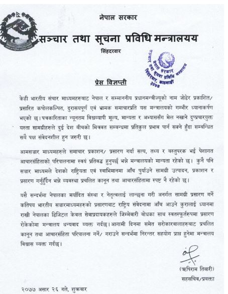 नेपालले नयाँ नक्सा जारी गरेयता भारतीय सञ्चार माध्यमहरुले नेपालविरुद्ध आधारहीन तथ्यहीन काल्पानिक समाचारहरु प्रशारण गर्दै आएका छन्।