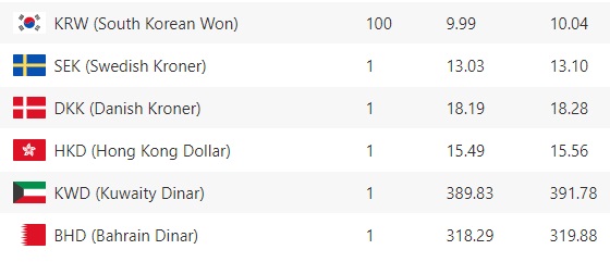 कुवेती दिनार एकको खरिददर ३८९ रुपैयाँ ८३ पैसा तथा बिक्रिदर ३९१ रुपैयाँ ७८ पैसा रहेको छ। बहराईन दिनार एकको खरिददर ३१८ रुपैयाँ २९ पैसा तथा बिक्रिदर ३१९ रुपैयाँ ८८ पैसा रहेको छ।