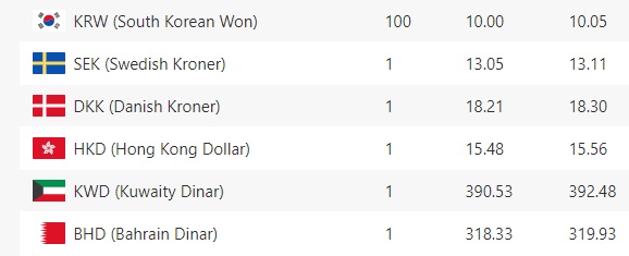 कुवेती दिनार एकको खरिददर ३९० रुपैयाँ ५३ पैसा तथा बिक्रिदर ३९२ रुपैयाँ ४८ पैसा रहेको छ। बहराईन दिनार एकको खरिददर ३१८ रुपैयाँ ३३ पैसा तथा बिक्रिदर ३१९ रुपैयाँ ९३ पैसा रहेको छ।