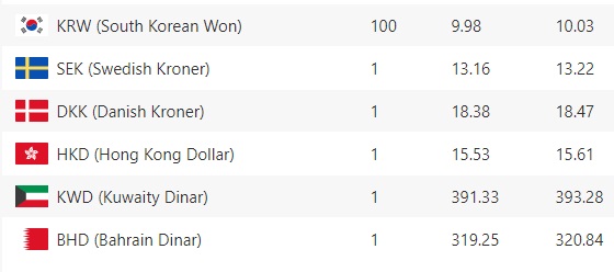 कुवेती दिनार एकको खरिददर ३९१ रुपैयाँ ३३ पैसा तथा बिक्रिदर ३९३ रुपैयाँ २८ पैसा रहेको छ। बहराईन दिनार एकको खरिददर ३१९ रुपैयाँ २५ पैसा तथा बिक्रिदर ३२० रुपैयाँ ८४ पैसा रहेको छ।