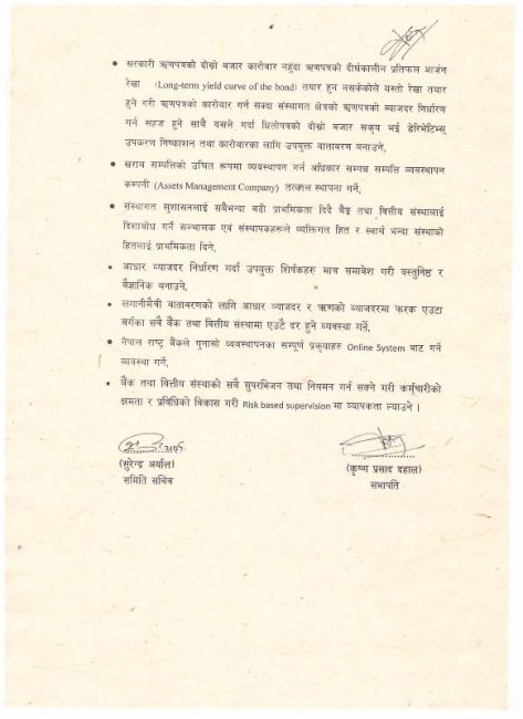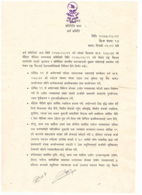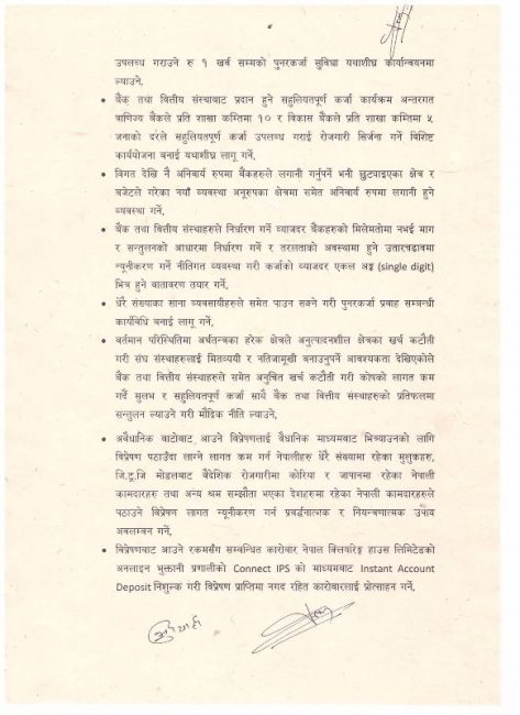 यसैगरी घरेलु साना तथा मझौला उद्यम तथा कारोना प्रभावित पर्यटन व्यवसायका श्रमिक तथा कर्मचारीको पारिश्रमिक भुक्तानीका लागि थपिएको एक खर्बको कर्जा प्रयोग हुने गरी कार्यविधि बनाएर लागु गर्न, प्रत्येक बाणिज्य बैंकले १० र विकास बैंक र फाइनान्सले ५ जनालाई सहुलियत ऋण दिने ग्यारेन्टी गर्न र रेमिट्यान्स पठाउदाको लागत न्यूनिकरण गर्न समेत निर्देशन दिएको छ।