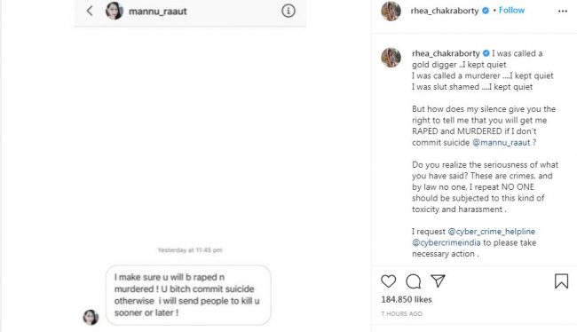 सुशान्तकी प्रेमिका रिया चक्रवर्तीले विभिन्न प्रकारको गाली र धम्की पाइरहेकी छिन् । उनलाई विभिन्न ठाउँबाट गाली तथा धम्कीहरु आएको बताइएको छ। यसैबीच रियाले एउटा यस्तो मेसेजको स्क्रिनसट सोसल मिडियामा पोस्ट गरेकी छिन् जसमा उनलाई बलात्कार र हत्या गरिदिने धम्की दिइएको छ ।