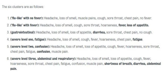 अनुसन्धानका लागि वैज्ञानिकहरुले अमेरिका र बेलायतका १ हजार ६ सय कोरोना संक्रमित बिरामीको तथ्यांकको विश्लेषण गरेका थिए । किंग्स कलेजका क्लेयर स्टिभ्सका अनुसार बिरामी भएको पाँचौं दिनसम्म बिरामी ६ मध्ये कुन वर्गको संक्रमित हो भन्ने थाहा भएमा समय छँदै राम्रोसँग उपचार गर्न सकिनेछ ।
