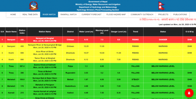 बाढी सूचना अलर्टका अनुसार नारायणीमा सोमबार दिउँसो जलस्तर ९.१५ मिटर छ। यहाँ ७.३ मिटरलाई लाई चेतावनीको स्तर र ८ मिटरलाई खतराको रुपमा लिइन्छ। हाल नारायणीमा जलस्तर खतराभन्दा पनि एकमिटर माथि पुगेको हो। अझै जलस्तर बढिरहेको महानिर्देशक राजभण्डारीले जानकारी दिए। उनले भने, ‘नदीले कटान गरिरहेको छ। हाम्रा कर्मचारीहरु जोखिममा परेकाहरुलाई स्थानान्तरणमा लागिरहेका छन्। अझै ४ दिन वर्षा हुने पूर्वानुमान छ। जलस्तर अझै बढ्न सक्छ।’