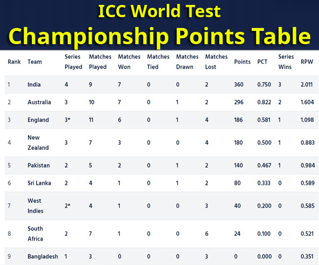 आईसीसी वर्ल्ड टेस्ट च्याम्पियनशिपको अंक तालिकामा ठूलो परिवर्तन